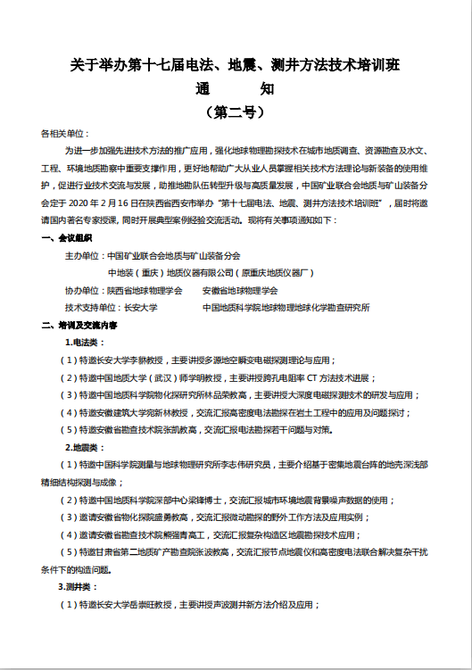 關(guān)于舉辦第十七屆電法、地震、測(cè)井方法技術(shù)培訓(xùn)班(二號(hào)通知)